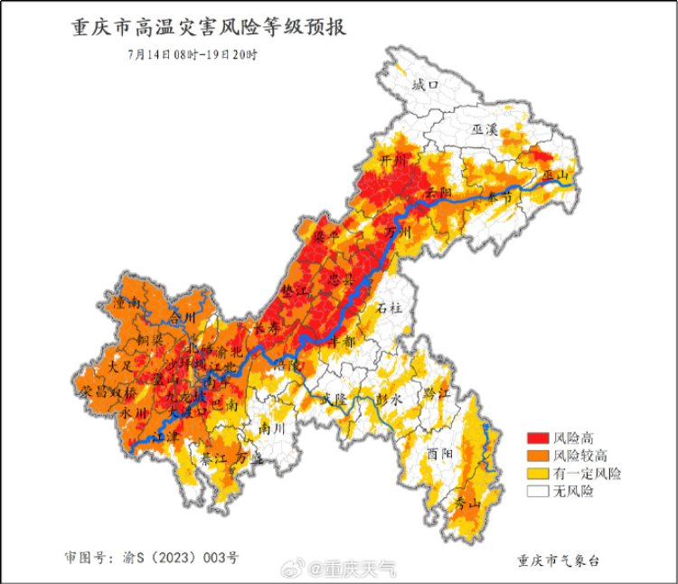 受晴热高温天气影响,预计7月14日至17日,重庆市中西部大部地区、东北部部分地区和东南部局部地区森林火险气象等级极高;7月18日至19日,重庆市大部地区森林火险气象等级高,局部地区等级极高。