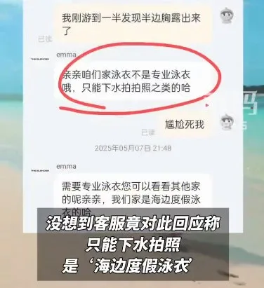 没想到,客服竟对此回应称:泳衣不是专业泳衣,只能下水拍照,并且主要标题已写明是“海边度假泳衣”。