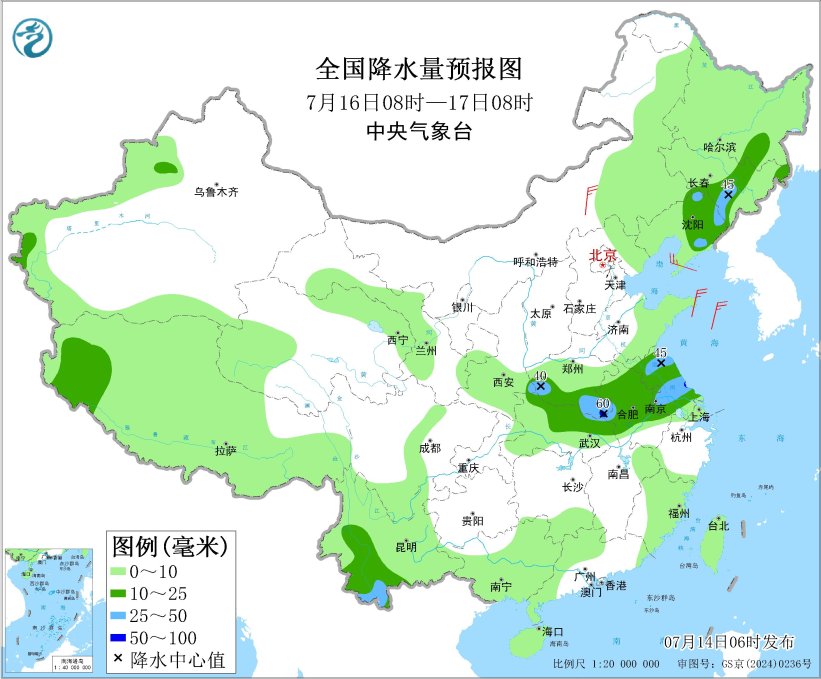 全国降水量预报图(7月15日08时-16日08时)