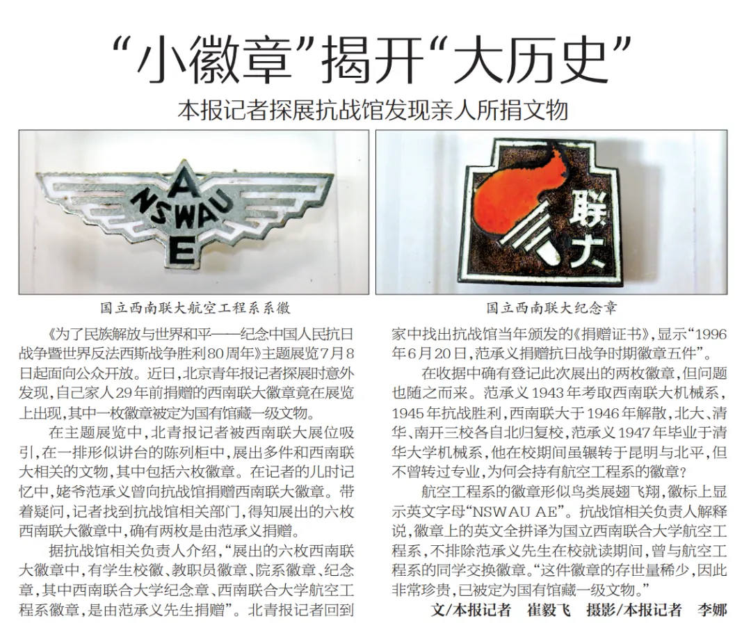 《为了民族解放与世界和平——纪念中国人民抗日战争暨世界反法西斯战争胜利80周年主题展览》7月8日面向公众开放。近日,北京青年报记者探展时意外发现,自己家人29年前捐赠的西南联大徽章竟在展览上出现,其中一枚徽章被定为国有馆藏一级文物。