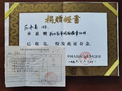 北青报记者回到家中,找出抗战馆当年颁发的《捐赠证书》,显示在1996年6月20日,范承义捐赠抗日战争时期徽章五件。在收据中确有登记此次展出的两枚徽章,但问题也随之而来。