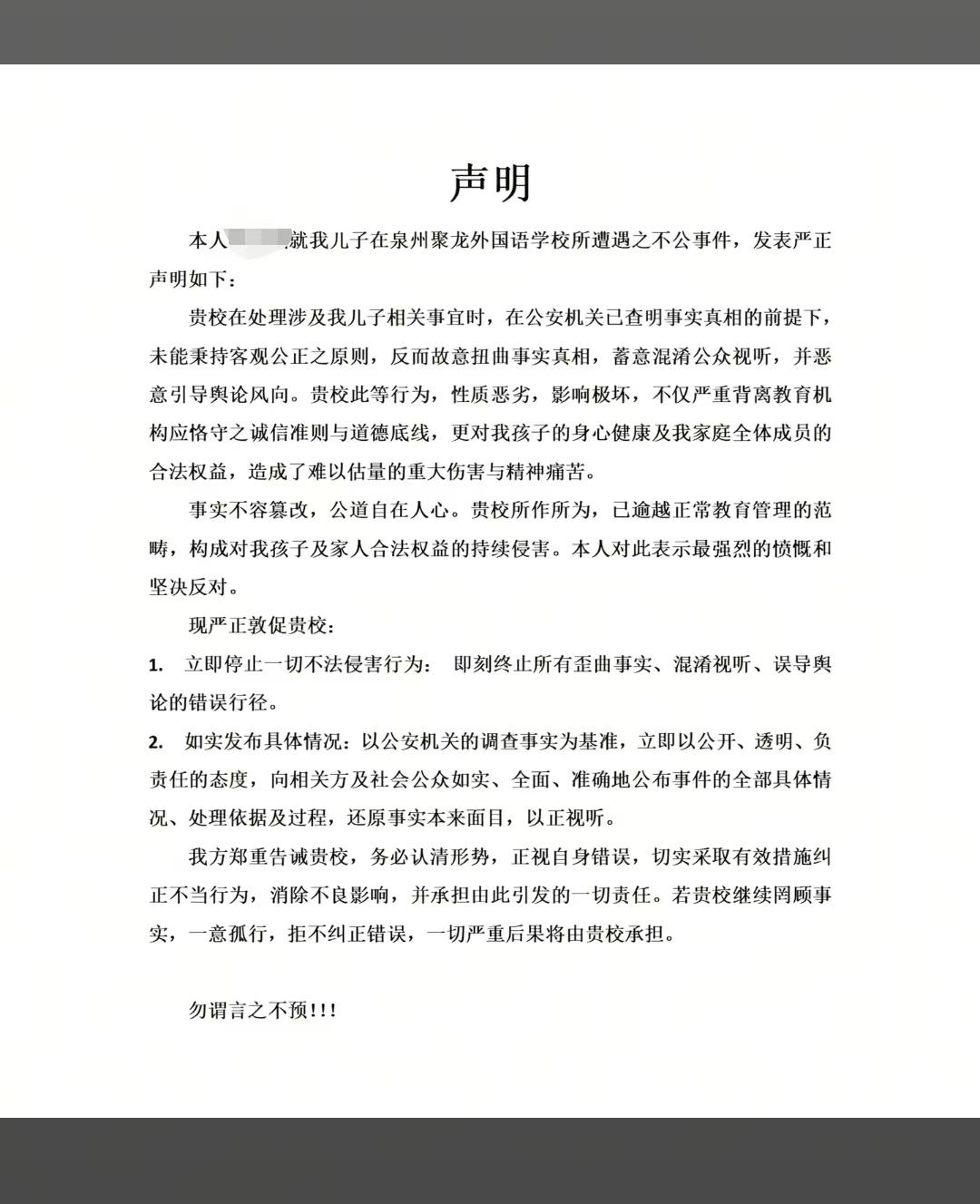 近日,在社交平台上,泉州聚龙外国语学校一位四年级学生家长投诉,班主任赵某要求其他同学掌掴他的儿子。此外,2024年生活老师曾拍摄他儿子裸照传给班主任,班主任随后对他的儿子进行言语侮辱。