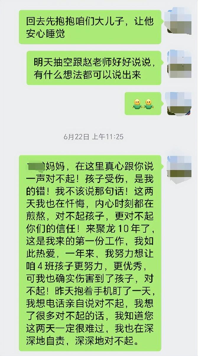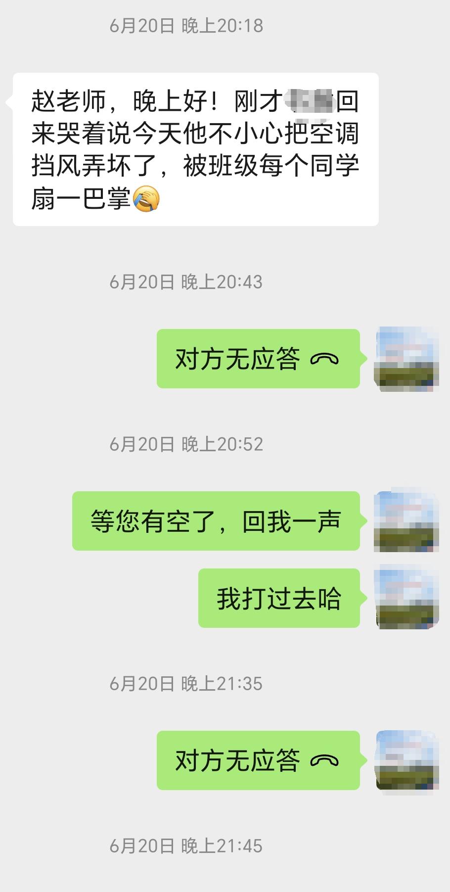他给华商报记者发了大量妻子手机微信中与班里每一位学生家长的聊天记录,内容有对孩子们成长的鼓励,也有对孩子们闪光点的赞许。即便是对这位学生,从聊天记录中也能看到他妻子和学生家长的对话充满了对孩子的关爱。直到6月20日晚,这位家长发消息:“赵老师,孩子刚回来哭着说今天他不小心把空调挡风弄坏了,被班级每个学生扇一巴掌。”约半个小时后,班主任向这位孩子的母亲发语音通话,未获应答。之后微信聊天记录显示,事发后班主任持续多日向其母亲解释、道歉,均未得到任何回应。“打电话也不接,事发后,这位家长拒绝和我妻子接触,不听任何解释。”他说。
