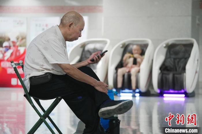 7月14日,河南郑州市民在地铁纳凉处休闲。 中新社记者李超庆摄
