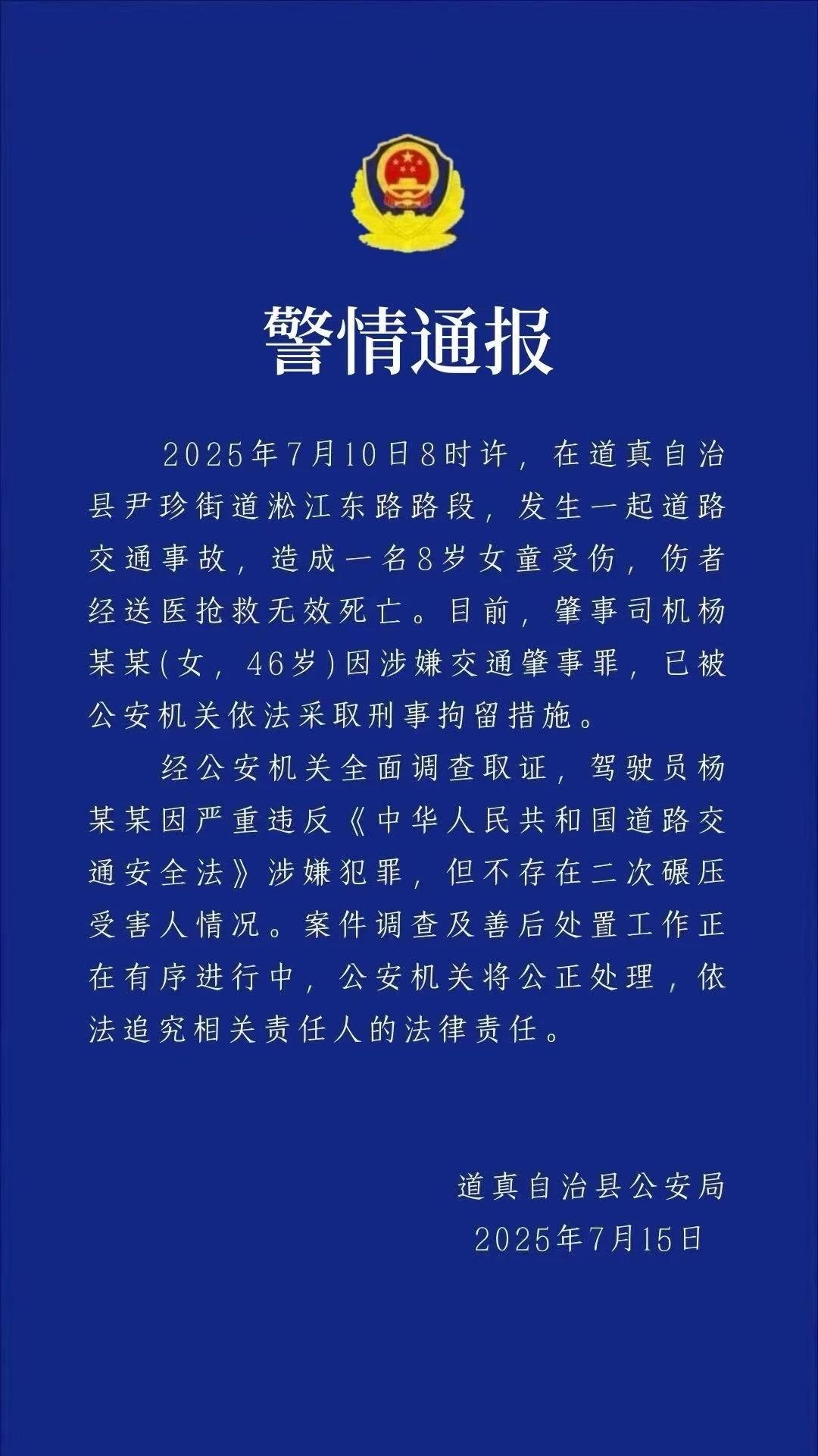 7月15日7时59分,道真县公安局发布警情通报称,7月10日8时许,在道真自治县尹珍街道淞江东路路段,发生一起道路交通事故,造成一名8岁女童受伤,伤者经送医抢救无效死亡。目前,肇事司机杨某某(女,46岁)因涉嫌交通肇事罪,已被公安机关依法采取刑事拘留措施。