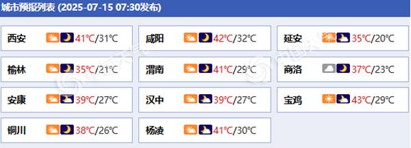 陕西多地昨天(7月14日)遭遇高温酷热天气,兴平、周至等地热到破纪录。今明天,陕西关中平原等地酷热天气持续,省会西安最高气温或连续达到41°C,公众请做好防晒降温工作,谨防中暑。