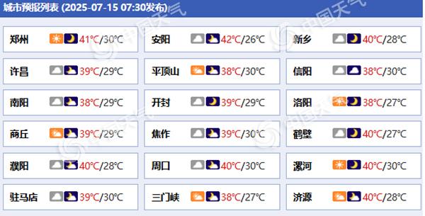 河南未来三天(7月15日至17日)雨热同台,郑州等多地最高气温可达40℃以上,需注意防暑降温;西部、南部等地有阵雨或雷雨,局部伴有强对流天气,外出携带雨具,如遇雷电大风需及时到坚固建筑物躲避。