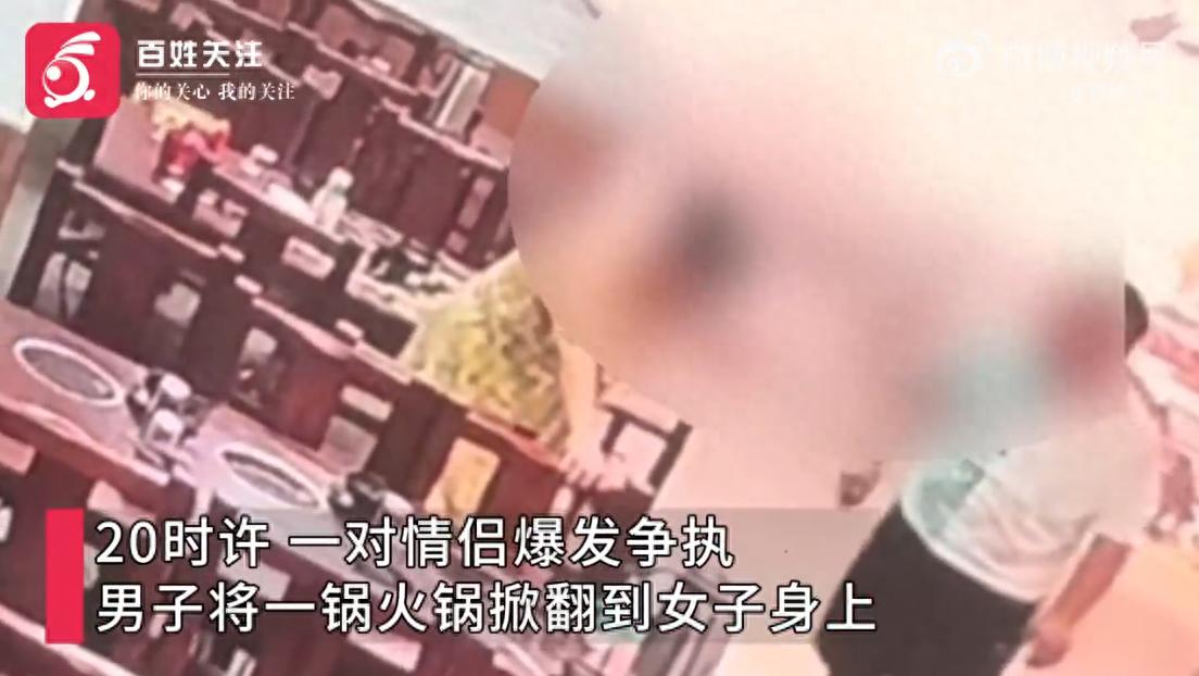 7月14日20时许,内蒙古鄂尔多斯市一对情侣爆发争执,男子将一锅火锅掀翻到女子身上。视频显示,两男女在吃饭时发生口角,女子先用水泼了男子,男子随后起身将火锅盆掀翻,锅中汤油溅到女子身上。15日,事发餐馆工作人员回应记者称,当事女子并未受伤。事发时,当事男女都喝了酒,随后民警到场将两人带走。