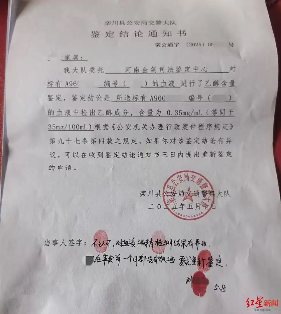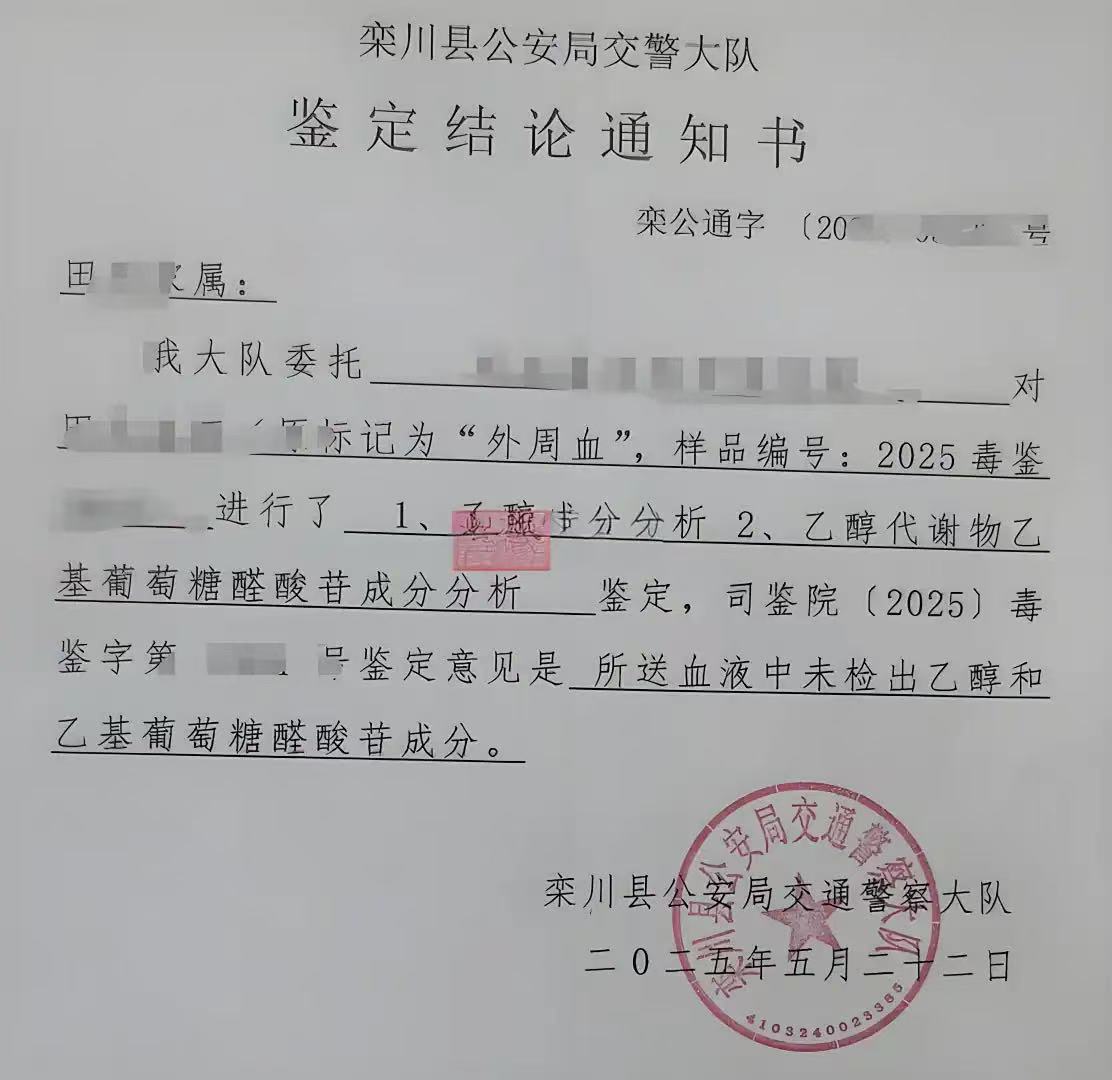 2025年5月22日,应家属要求,公安机关进行的第二次抽血检验结果,确认所送血液未检出乙醇成分。贾女士记者,在鉴定结果出来的同时,他们也收到了交警出具的交通事故责任认定书,认定书确认当事人田某及乘客均无事故责任。