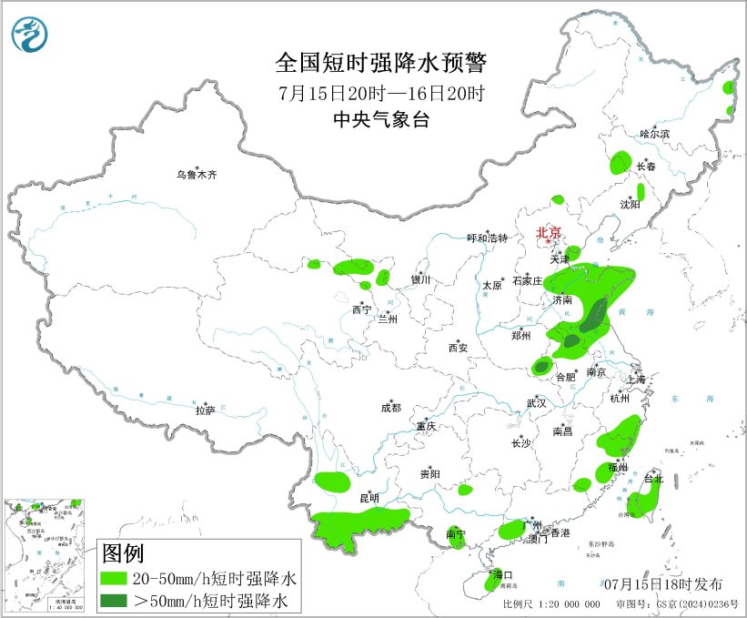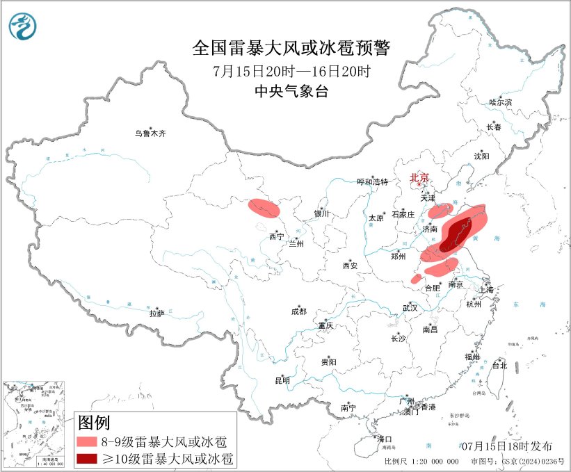 预计7月15日20时至16日20时,黄淮、江淮等地的部分地区将有8级以上雷暴大风或冰雹天气,其中,山东中东部和南部、江苏北部等地的部分地区将有10级以上雷暴大风,最大风力可达11级以上;黄淮、江淮、江南地区东部、西南地区南部、东北地区东部、西北地区东北部等地的部分地区将有小时雨量大于20毫米的短时强降水天气,其中,山东中东部和南部、河南南部、安徽北部、江苏北部等地的部分地区小时雨量大于50毫米,最大可达60毫米以上。