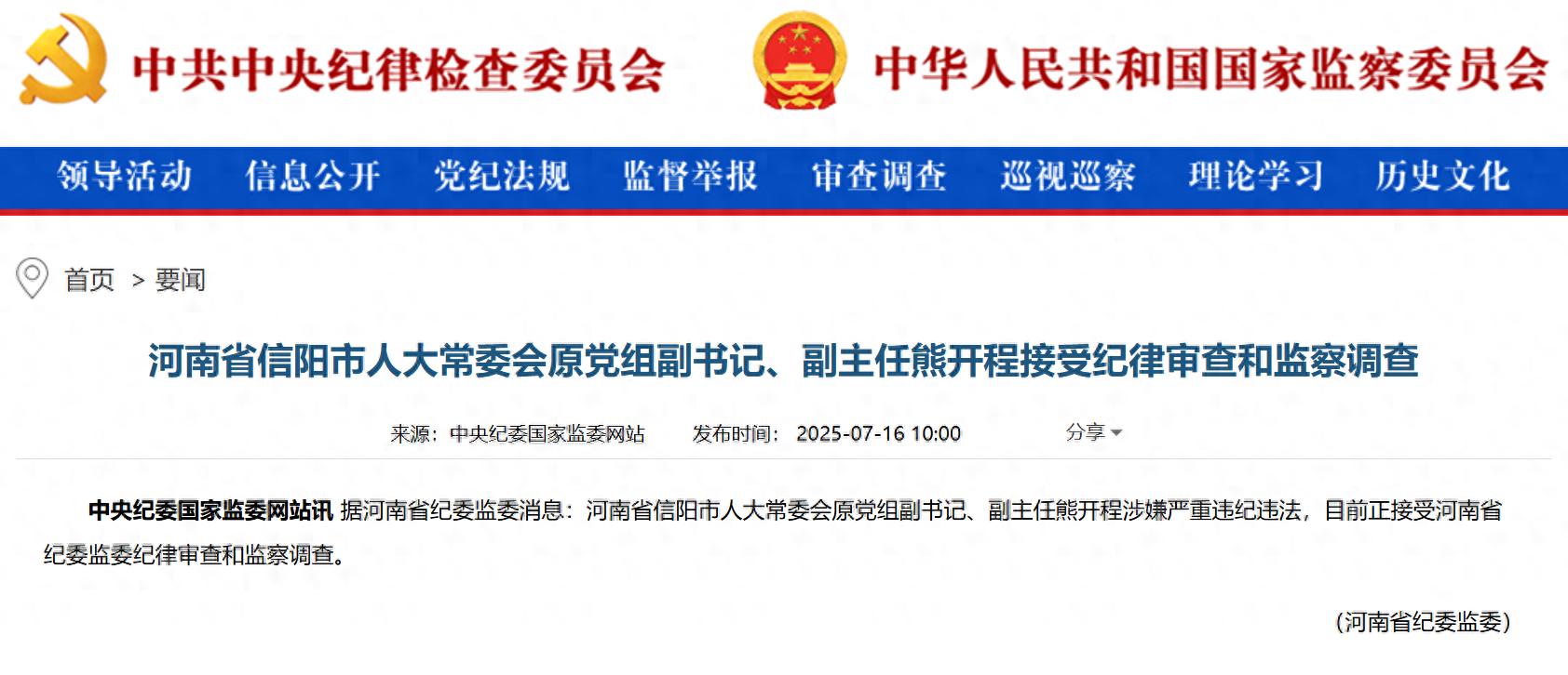 中央纪委国家监委网站7月16日通报,河南省信阳市人大常委会原党组副书记、副主任熊开程涉嫌严重违纪违法,目前正接受河南省纪委监委纪律审查和监察调查。