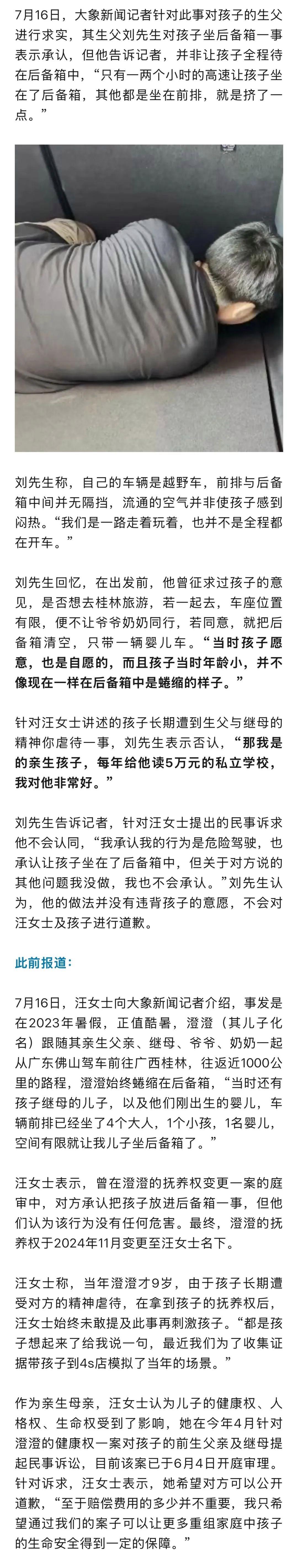 近日,“一9岁男童与生父继母出行被安排后备箱”一事引发众多网友关注,其生母汪女士告诉记者,此事发生于2023年暑假,孩子跟随其亲生父亲、继母、爷爷、奶奶一起从广东佛山驾车前往广西桂林旅游,由于车辆前排座位有限,便把儿子安排在后备箱里。