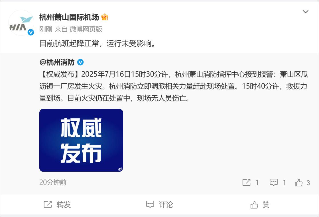 2025年7月16日15时30分许,杭州萧山消防指挥中心接到报警:萧山区瓜沥镇一厂房发生火灾。杭州消防立即调派相关力量赶赴现场处置。15时40分许,救援力量到场。目前火灾仍在处置中,现场无人员伤亡。