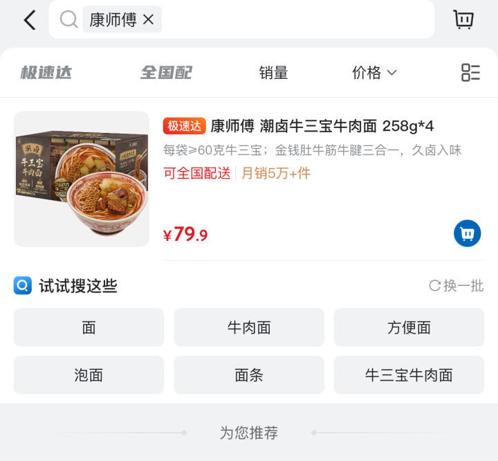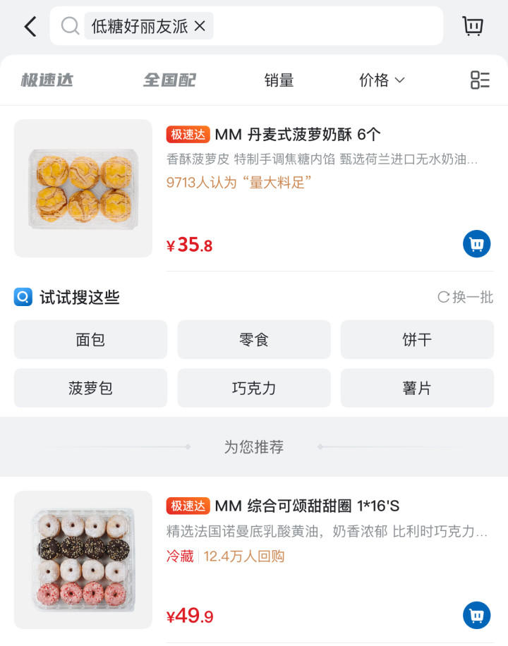 不过,同样被网友声讨的徐福记、康师傅和有友等品牌,还有若干品类有销售。例如,徐福记有一款“呈味空见底GI蛋糕”有售,售价为49.9元/盒,康师傅的潮卤牛三宝牛肉面、有友托孤鸭掌等产品,在APP上也均有销售。