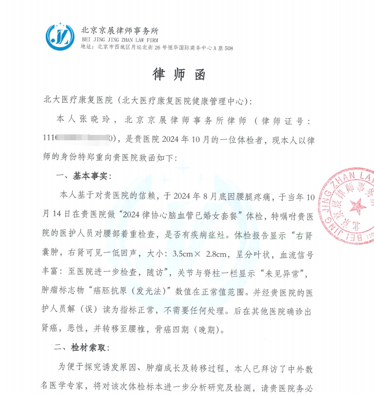 从2013年到2023年,北京执业律师张晓玲连续10年在爱康国宾进行体检,从未检查出患癌风险,却在2024年被确诊为癌症晚期。