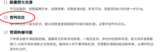△张晓玲2023年在爱康国宾的体检报告,显示肾钙化灶,未提示患癌风险,且医生告诉她不用处理。