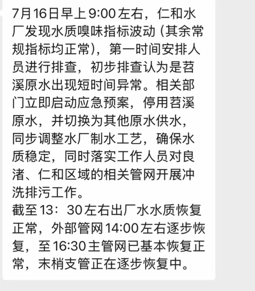 此外,受访市民向澎湃新闻提供了一段物业服务群里的截图,内容显示:7月16日早上9:00左右,仁和水厂发现水质嗅味指标波动(其余常规指标均正常),第一时间安排人员进行排查,初步排查认为是苕溪原水出现短时间异常。相关部门立即启动应急预案,停用苕溪原水,并切换为其他原水供水。