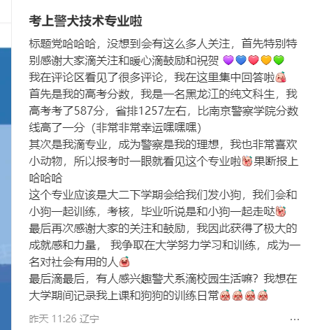 7月17日,潇湘晨报记者联系到发帖人陈同学,来自黑龙江哈尔滨的陈同学坦言,自己最初对警犬技术专业了解不深。但警察是她向往的职业,加之平时非常喜欢小动物,“和小动物在一起相处我感到非常开心,我觉得这是我实现人生价值的一种方式。”因此,在看到该专业招生信息后,她果断填报了志愿。