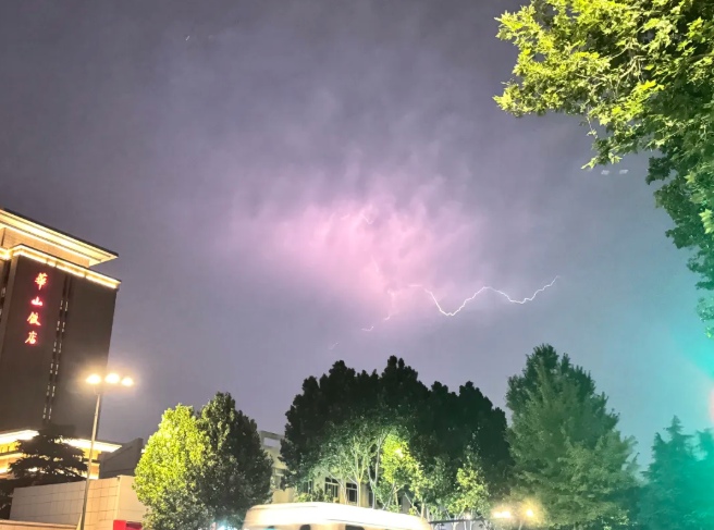 6日晚,南京遭遇强对流天气,夜空中上演了一场“闪电盛宴”。密集的闪电持续高频闪现,每分钟可达数十次,漆黑的夜空被一次次照亮,宛如安上了巨型闪光灯。许多市民拍下这震撼的画面,分享到朋友圈和社交平台,“这是电母在开露天派对吗?有幸同场蹦迪了”“是谁在渡劫飞升?排面太足了”“第一次见到紫色的闪电”……