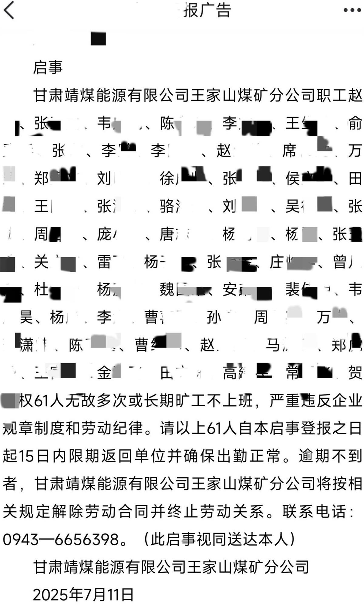 近日,甘肃靖煤能源有限公司王家山煤矿分公司登报“喊话”该煤矿61名职工限期回单位上班一事,引发关注。
