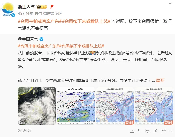 据中国天气消息,从目前预报看,未来台风可能排着队上线。除了即将生成的6号台风“韦帕”外,之后还可能有7号台风“范斯高”、8号台风“竹节草”接连生成......