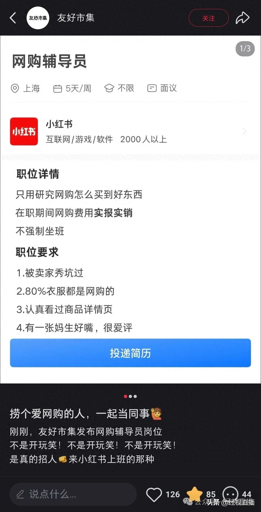 “被买家秀坑过、80%衣服都是网购的、有一张好嘴,爱评价”等。招聘信息注明该岗位不强制坐班,且在职期间网购费用实报实销。