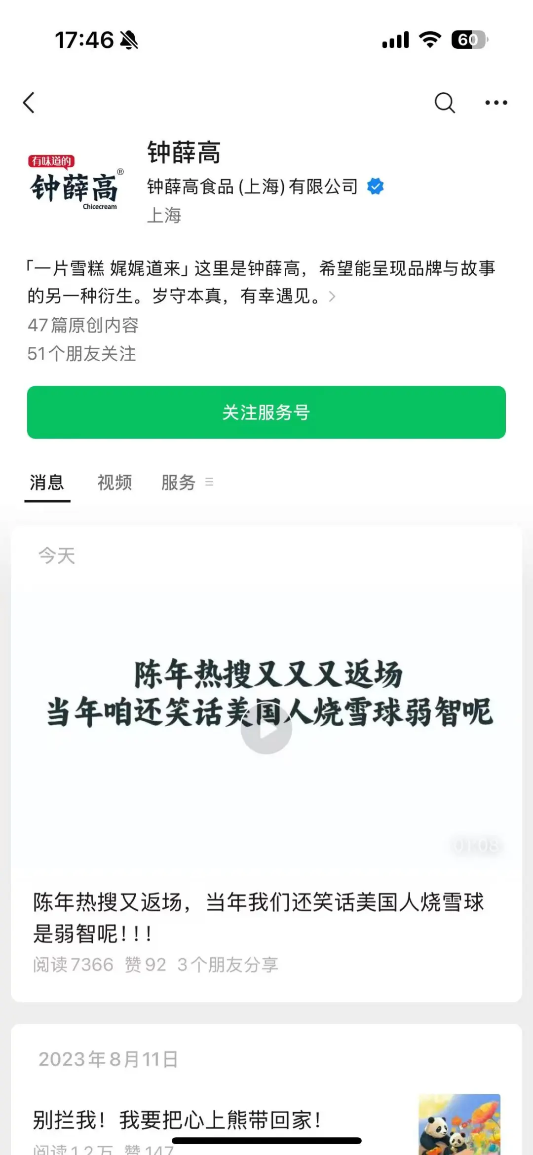 这是钟薛高的官方微信公众号时隔2年第一次发布内容,上一次的内容发布时间为2023年8月11日。