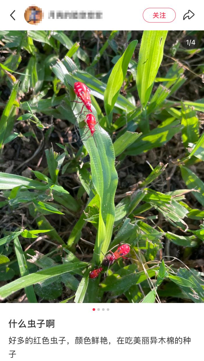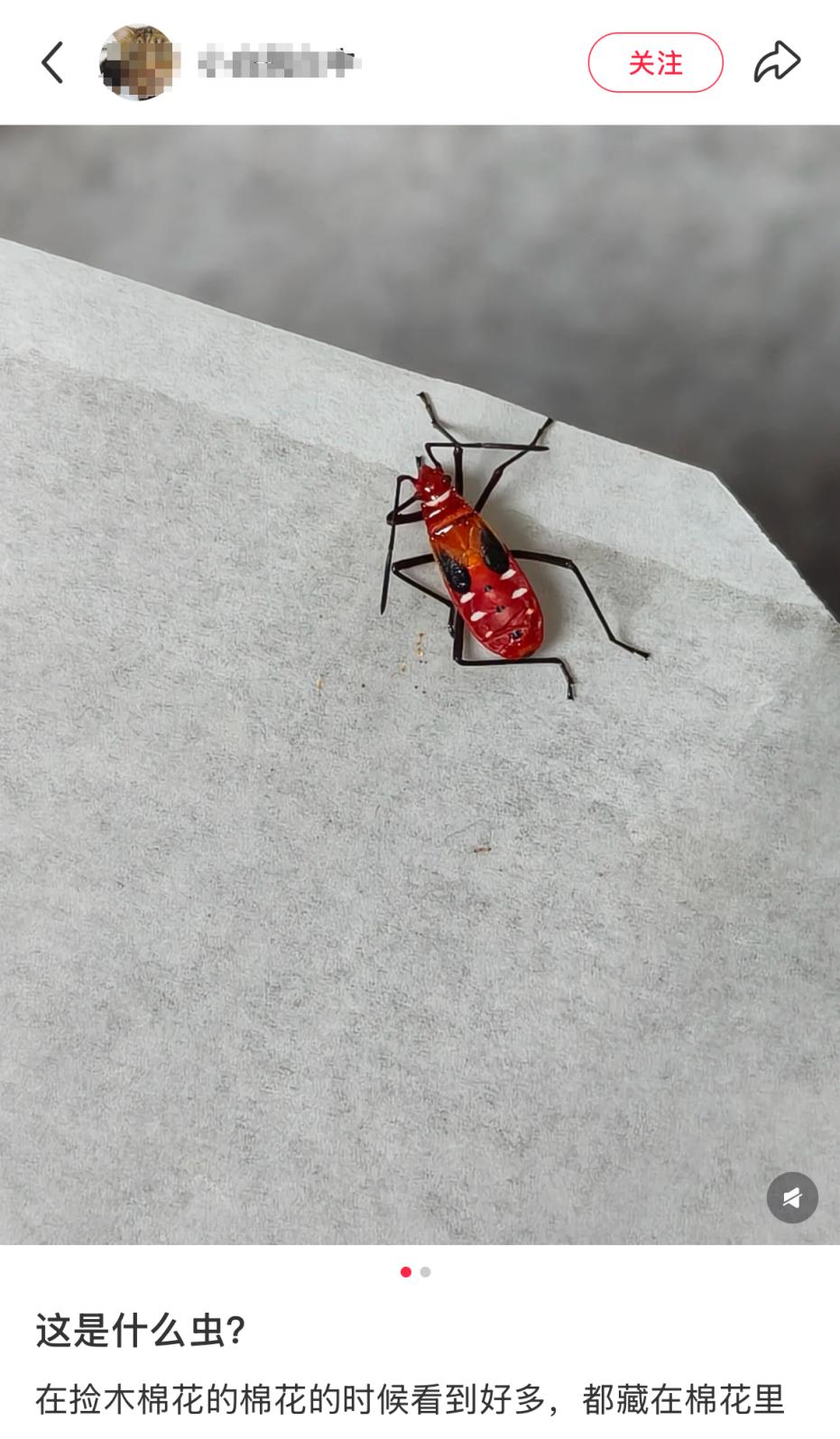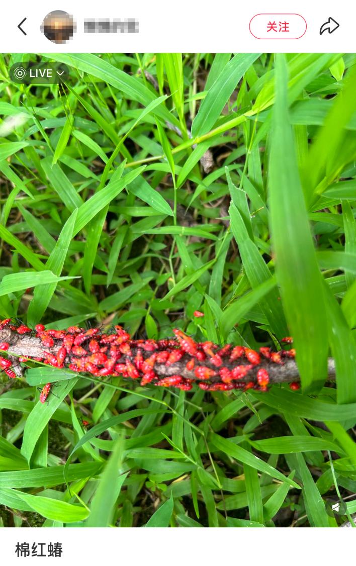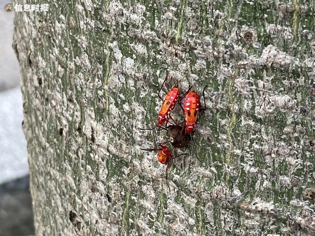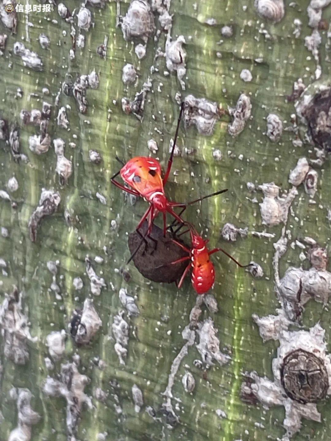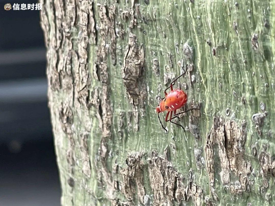 据了解,该红色虫子为棉红蝽,是一种植食性昆虫,主要以植物的叶片、汁液为食,尤其是木棉树的果子。每到夏季棉红蝽都比较常见,一般不会主动攻击人,其身上鲜艳的红色是对捕食者的“警示色”。一般来说棉红蝽在人身上爬一爬并不会有什么影响,但如果把它捏死,它分泌的汁液可能会对部分皮肤容易过敏的人群有影响,建议不要随意触摸。