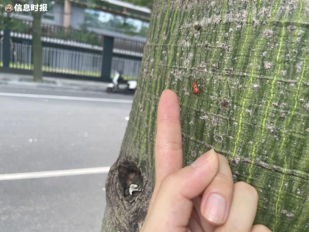 7月17日,信息时报记者赶到现场看到:目前,该处部分异木棉树干上仍能看到红色虫子,个头为指头不到的大小,红色的身躯上布满了黑白的斑点,部分虫子正两三扎堆对结在树干上的棉絮荚子进行啃吃,公园内有绿化工人正在对园内的植物及路边的异木棉树喷洒杀虫剂。