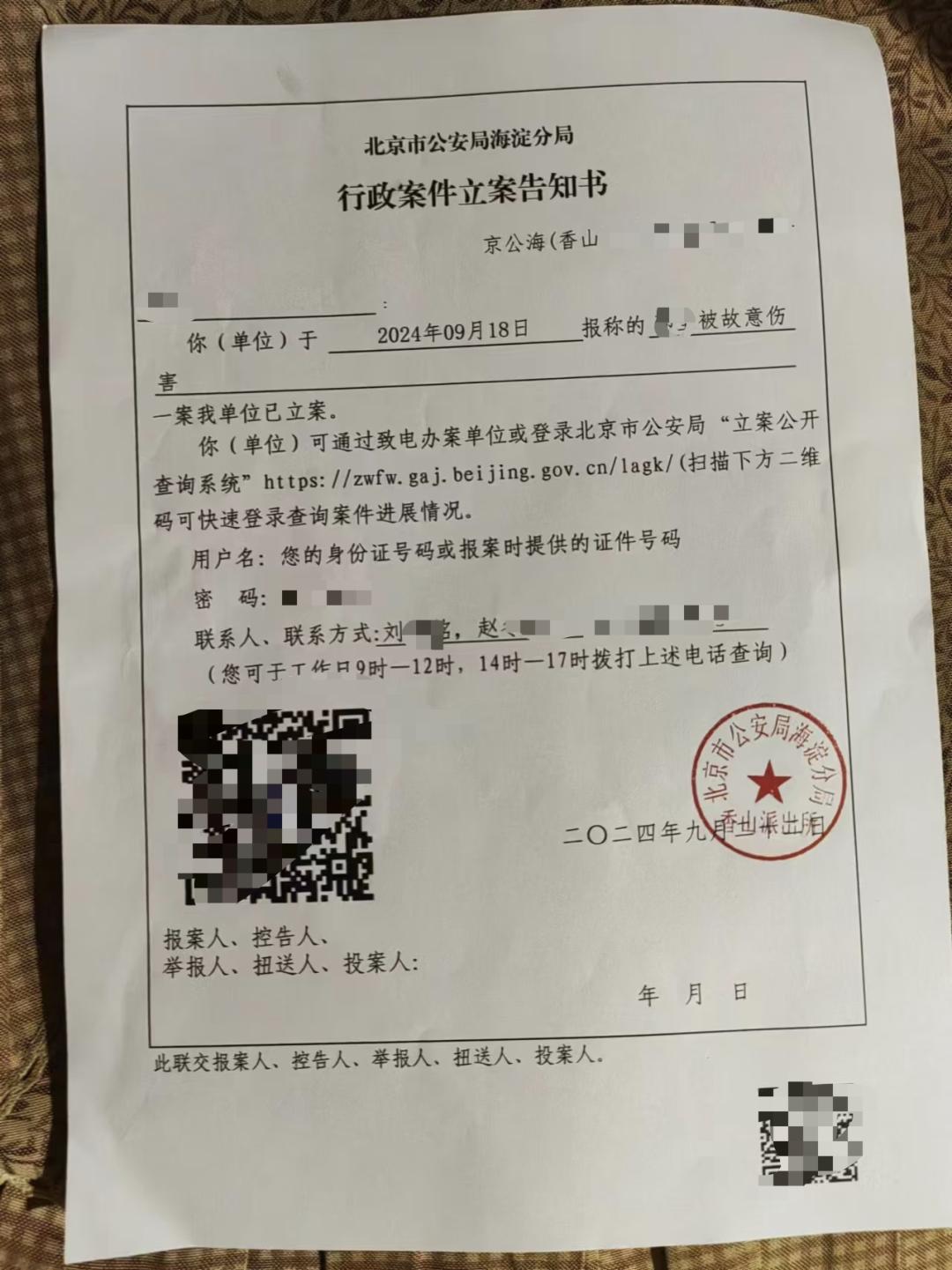 2025年3月,北京海淀香山派出所回复,已向海淀分局提交验伤申请,让其等回复。
