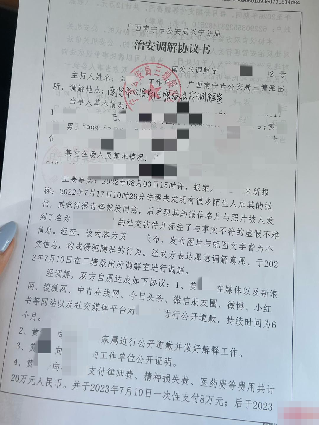 相关判决材料显示,黄某在公安机关做笔录时,承认自己发布虚假信息,也知道自己的行为使得吴女士身体健康受到严重影响,遭受舆论压力,造成她离婚。当时,黄某在派出所签下《治安调解协议书》,愿公开向吴女士及其家属道歉并赔偿20万元。可离开派出所后,黄某却未按期履约。2023年7月12日,南宁市公安局兴宁分局作出《行政处罚决定书》,对黄某处以行政拘留10日,罚款500元的处罚。