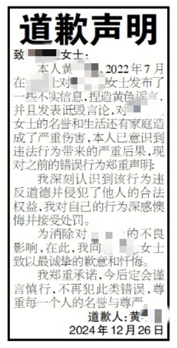 2024年12月26日,黄某在广西一报纸上发布道歉声明,承认自己在社交平台上对吴女士发布了一些不实信息,捏造黄色谣言,并且发表诋毁言论,对吴女士的名誉和生活还有家庭造成了严重伤害。吴女士认为,其毫无悔过之心,黄某做完笔录后,仍长期在社交软件上发布不堪入目的言论和图片,直到被举报封号。