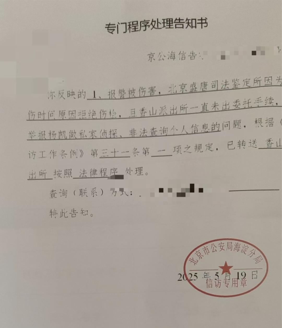 5月19日,小玲收到北京市公安局海淀分局的“专门程序处理告知书”,回复其报警被伤害,北京盛唐司法鉴定所因为受伤时间原因拒绝伤检,且香山派出所一直未出委托手续。至于举报杨某做私家侦探、非法查询个人信息的问题,已转送香山派出所按照法律程序处理。