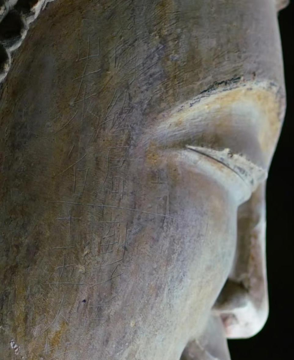 ▲佛像头部刻字 网友发布的图片,因时间久远相关部门尚无法确认究竟是谁刻字是否冒名等