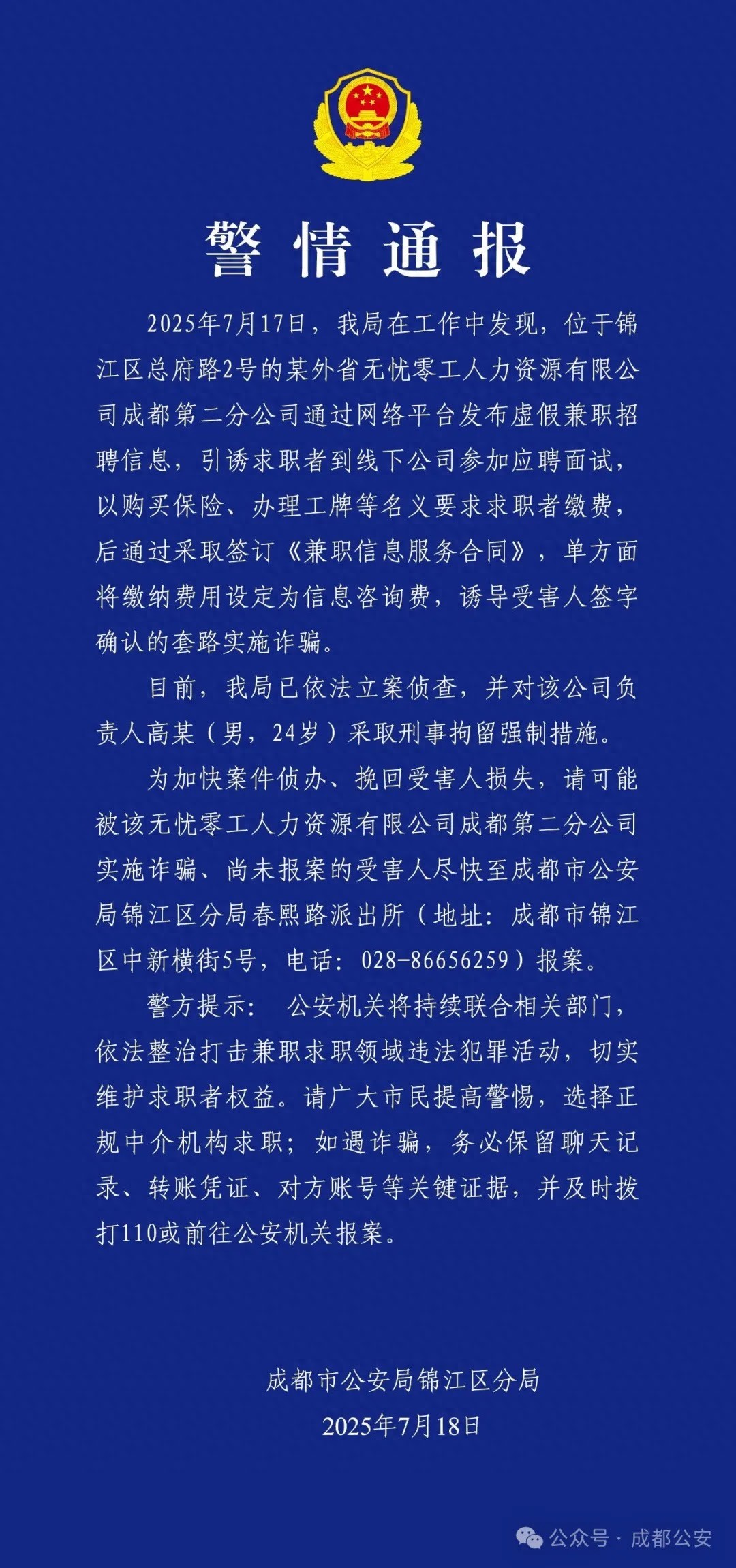 目前,我局已依法立案侦查,并对该公司负责人高某(男,24岁)采取刑事拘留强制措施。为加快案件侦办、挽回受害人损失,请可能被该无忧零工人力资源有限公司成都第二分公司实施诈骗、尚未报案的受害人尽快至成都市公安局锦江区分局春熙路派出所(地址:成都市锦江区中新横街5号,电话:028-86656259)报案。