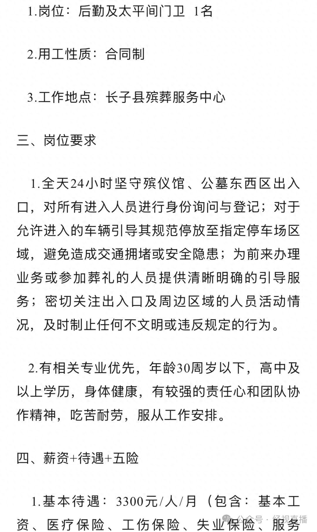 7月14日,山西省长治市长子县殡葬服务中心发布一则招聘公告,招聘合同制后勤及太平间门卫,要求年龄30周岁以下。岗位工作内容是全天24小时坚守殡仪馆、公墓出入口,负责询问和登记进入人员身份,引导车辆规范停放,引导办理业务人员遵守相关规定,以及制止不文明或违反规定的行为。岗位基本待遇是3300元一个月,绩效200元一个月,按照年度发放。