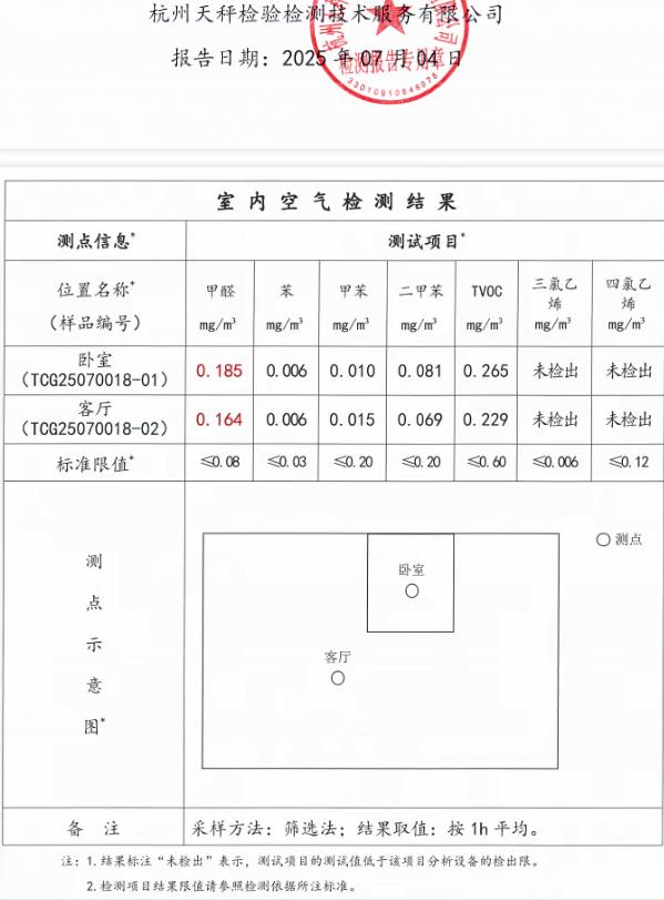 网友马先生在社交平台发帖称,他在杭州入住一处月租6万余元的出租房期间,出现长时间咳嗽、胸闷、过敏等身体异常情况,确诊慢性咽炎、结膜炎干眼症、扁桃体肿大等病症。他邀请了检测机构做甲醛检测,发现房子的甲醛含量超标近三倍,但房东不回应他退还全部押金的要求。