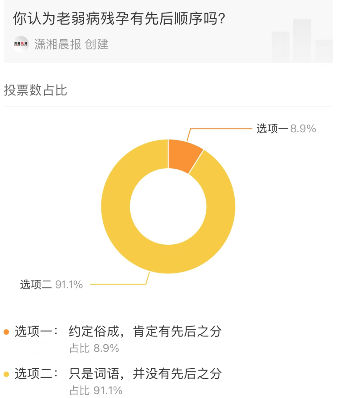 一项投票近3000人参与的投票显示,仅有8.9%的网友认为“老弱病残孕”存在优先顺序,而91.1%的人认为“老弱病残孕”并不存在优先顺序。