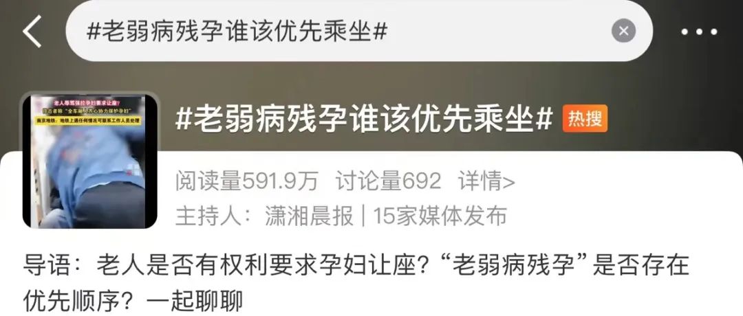 中华志愿者协会法律服务志愿者委员会“老年维权志愿使者”、北京京本律师事务所主任连大有也认为,“‘老弱病残孕’这几类群体并没有法律规定先后顺序,只是习惯性说法。”“老弱病残孕”无疑是社会中的弱势群体,都需要得到特殊关照和保护。连大有认为,至于同时出现“老弱病残孕”几类人,谁应该更优先,应按照具体情况中谁的情况更紧急、凭借朴素的民法一般人的意识区分。显然,怀孕的女人比身体健康的老年人在地铁里更需要优先对待。在此前发生的一则“女子疑因不愿给老人让座遭拐杖袭扰”的事件中,中国妇女报曾发表评论——社会要尊老,青年要敬老,这是美德,要大力倡导。与此同时,为老要自尊,不能倚老卖老。如此,才能双向奔赴,构建全龄友好的社会。你怎么看呢?评论区聊一聊吧!