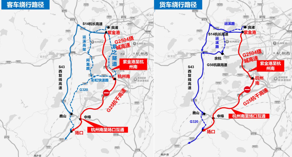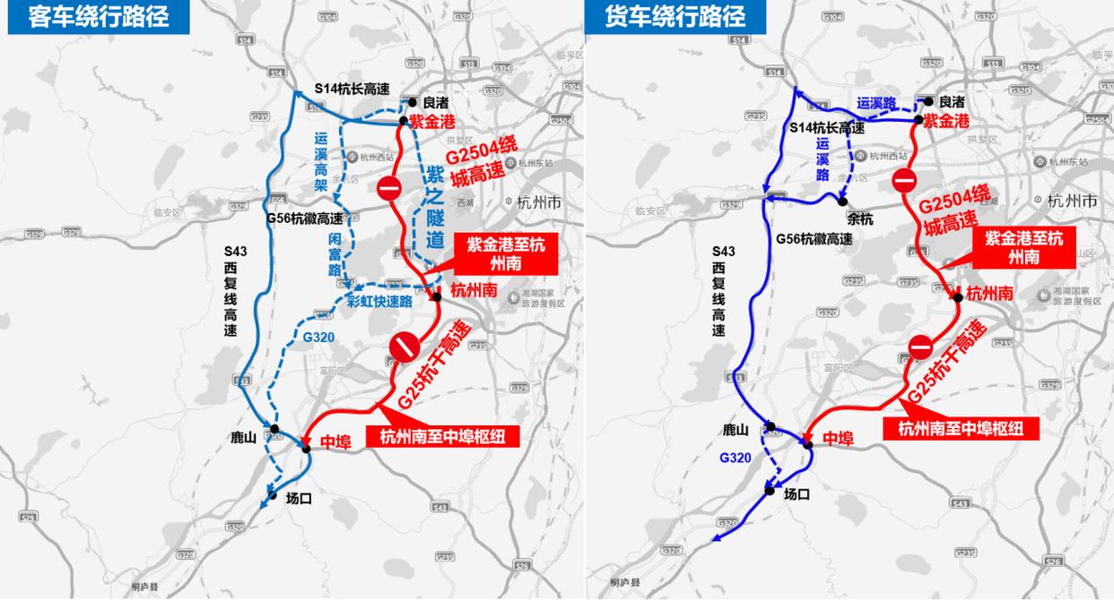 3.可由良渚收费站提前下高速,货车由运溪路—余杭收费站—G56杭徽高速—汪家埠枢纽—S43西复线高速—鹿山—G320—场口—G25杭新景(杭千)高速绕行。