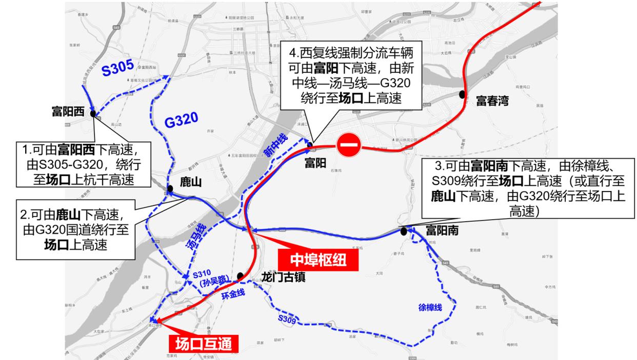 3.未提前绕行被强制分流车辆,可由富阳下高速,由新中线—汤马线—G320—场口上G25杭千高速。