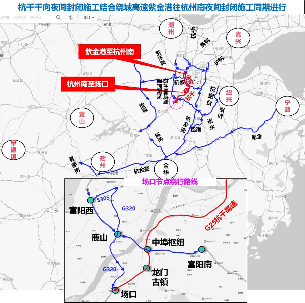因G25杭千高速千向施工与G2504绕城紫金港往杭州南同期进行,因此还需考虑紫金港往千岛湖方向的绕行路线。