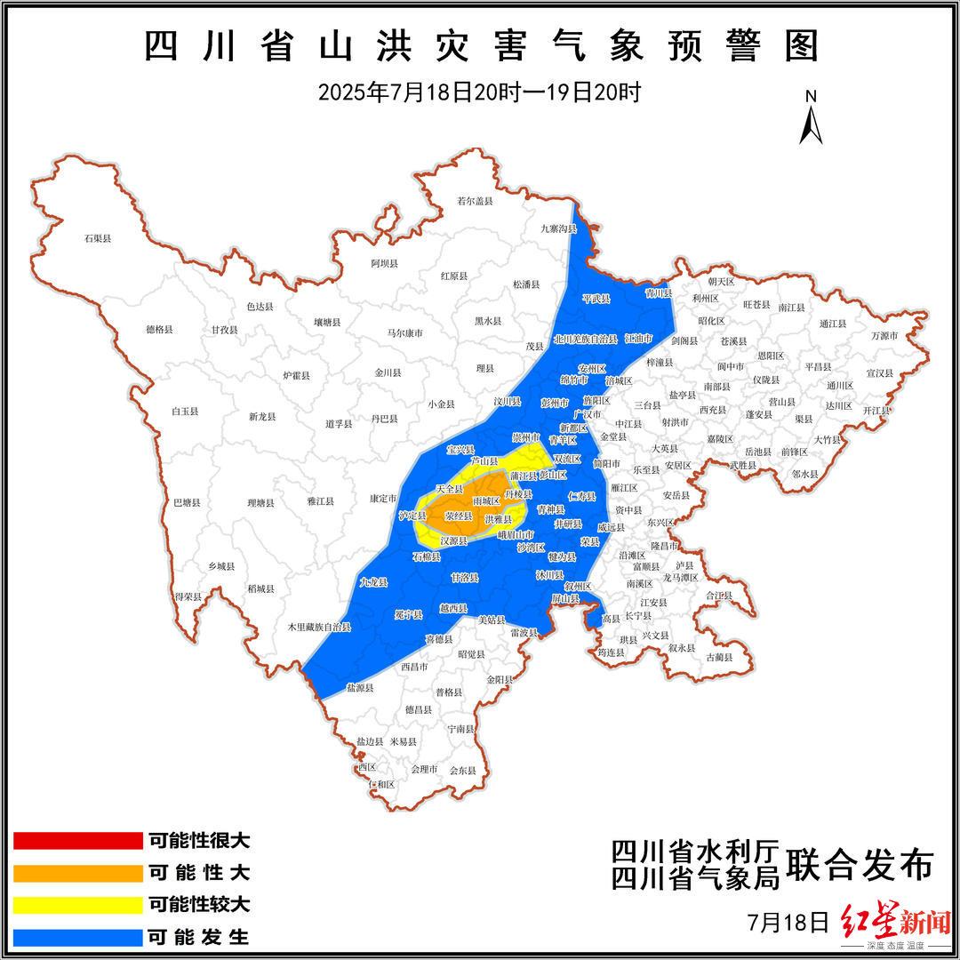 眉山市东坡、仁寿、青神,成都市双流、彭州、都江堰、龙泉驿、青白江、简阳,乐山市市中区、金口河、井研、五通桥、峨边、沙湾、犍为、沐川、马边,德阳市什邡、绵竹、广汉、罗江、旌阳,自贡市荣县、贡井,绵阳市安州、涪城、江油、北川、游仙、梓潼、平武,内江市威远、资中,宜宾市叙州、屏山、高县,广元 市青川、剑阁,资阳市雁江,凉山州甘洛、越西、冕宁、喜德、雷波、西昌、盐源、木里、美姑,阿坝州九寨沟、汶川、茂县、松潘,甘孜州九龙、康定等55个县(市、区)可能发生山洪灾害(蓝色)。