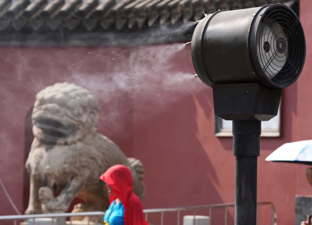 ◎7月10日,沈阳故宫入口处安装了冷雾降温风扇图源:新华社记者 李钢 摄