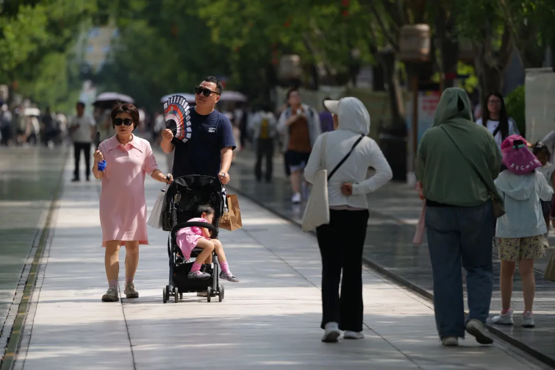 ◎6月23日,在北京前门大街,游客在高温下参观游览图源:新华社记者 鞠焕宗 摄