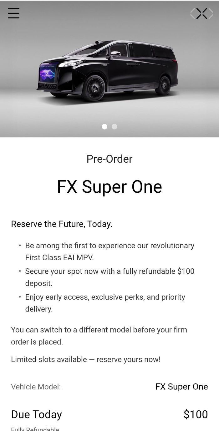 正常直播仅仅持续1个小时,临近结束大屏幕上的实时数据显示,FX Super One一小时内下定量为10034台。发布会称,这款车将在2025年底正式下线,并开启交付,预计定价可能会在8万美元内(约合人民币58万元内)。