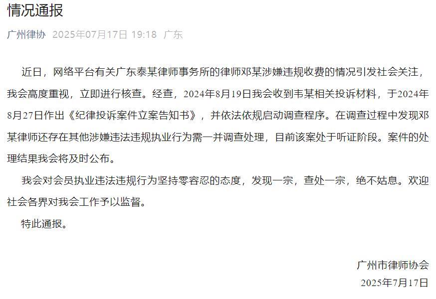 此事在网络引发关注。7月17日晚,广州律协发布通报称,2024年8月19日该会收到韦某相关投诉材料,于2024年8月27日作出《纪律投诉案件立案告知书》,并依法依规启动调查程序。在调查过程中发现邓某还存在其他涉嫌违法违规执业行为需一并调查处理,目前该案处于听证阶段。案件的处理结果将会及时公布。