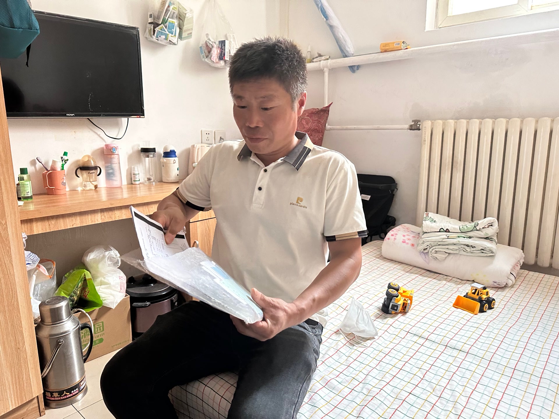 46岁的孟世祥来自河南省夏邑县,来京已两年。他来京的初衷,是为患有罕见病的小儿子求医。“我的两个儿子都患了罕见病。大儿子历经7次手术,最终落下终身残疾。小儿子两岁时,也被确诊为黏多糖贮积病二型。”孟世祥说,为给孩子治病,他和妻子带着小儿子租住在北京儿童医院附近,靠他每天跑十几个小时外卖挣钱,偿还外债和支付孩子后续的治疗费。