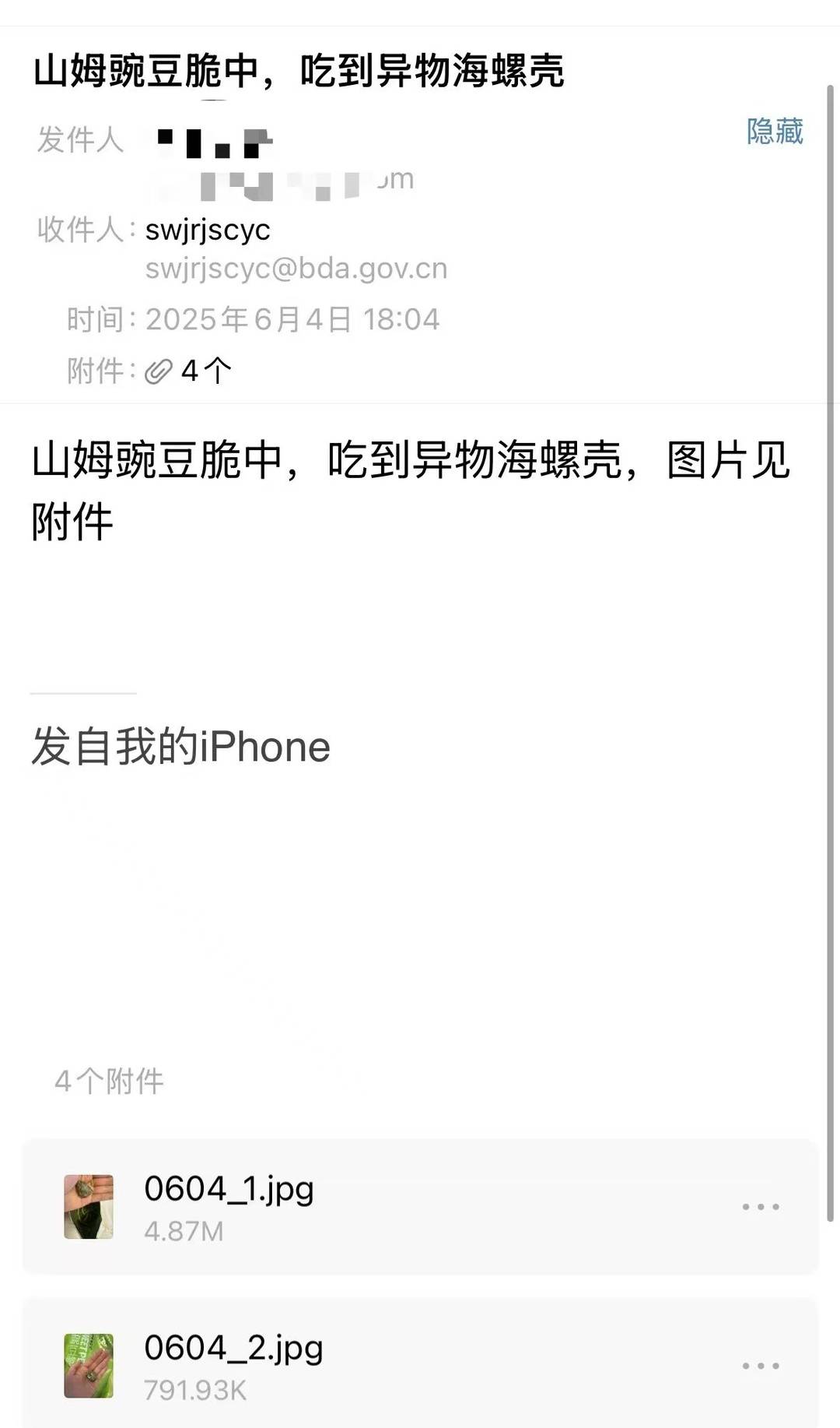 程女士反馈山姆豌豆脆零食吃出了海螺