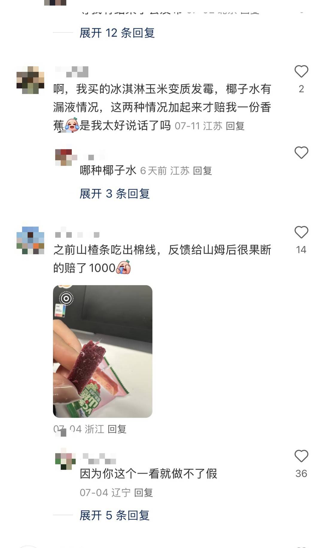 北京市民“Hao”称,自己此前曾在山姆会员店购买的紫菜中吃出了渔网丝;浙江网友“小龙女”晒出了自己之前购买的荔枝,其中个别已经变质;河北的网友也晒出了图片,显示在山姆会员店购买的饼干里发现了疑似毛线的异物;浙江网友“都市隶人”则表示购买的山楂条吃出棉线,成功获赔过1000元……